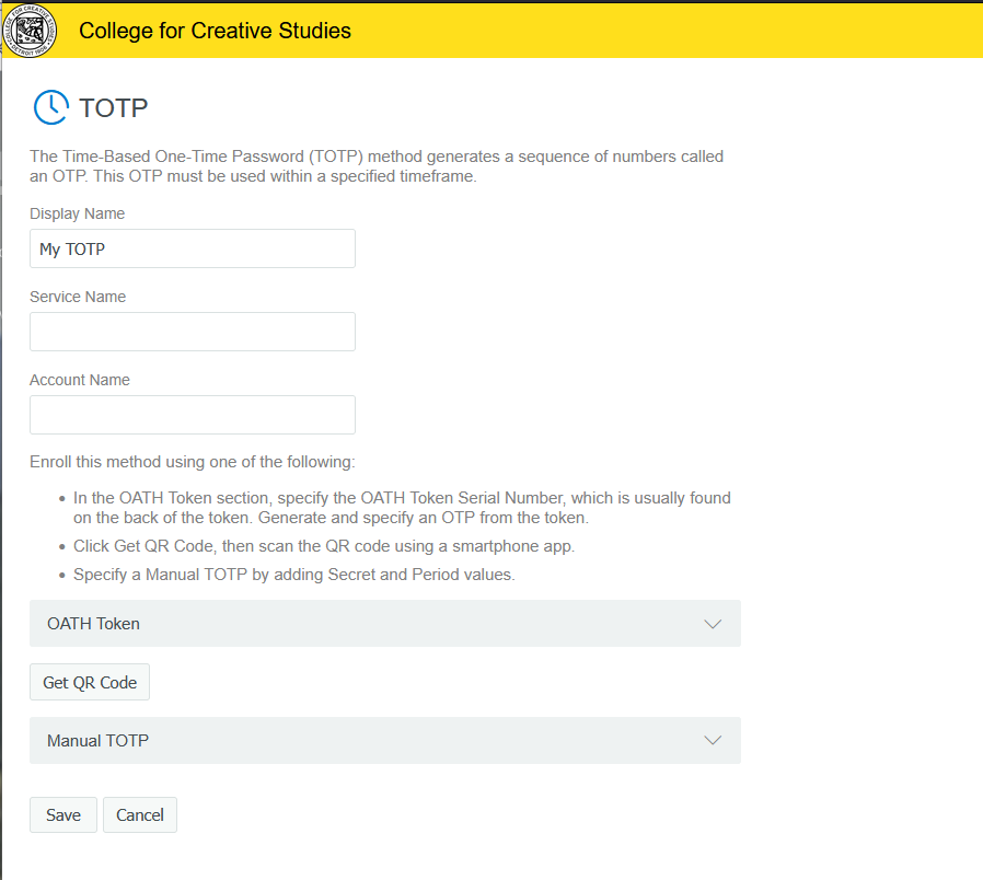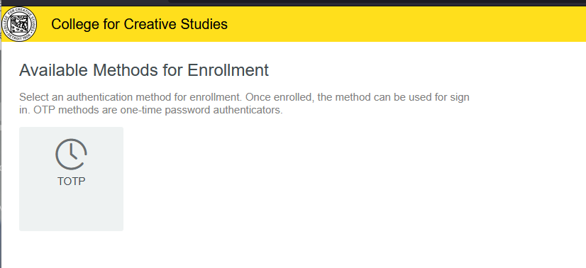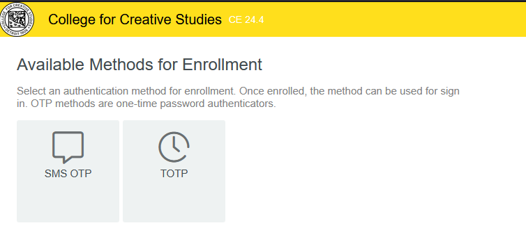 To add another method, click on the Add icon. At the present time, SMS OTP (receiving a code via text — see opt-in information below) and TOTP (through an app on a personal device) are the additional options. You may set up either or both of these.