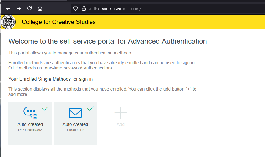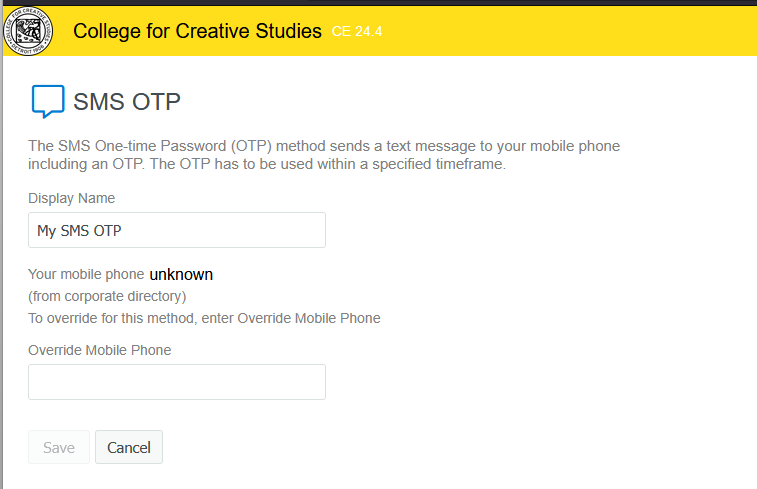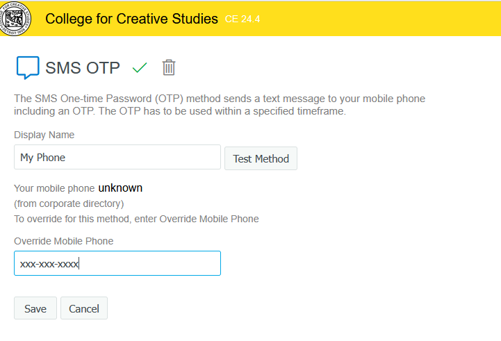SMS OTP sends a six digit code via text to a number you supply. By supplying your phone number here, you opt in and consent to receiving text messages from CCS for the purpose of multi-factor authentication. To revoke this access at any time, you can edit the SMS OTP option and click the delete icon (trash can) to remove this means of access or contact helpdesk@ccsdetroit.edu for assistance.