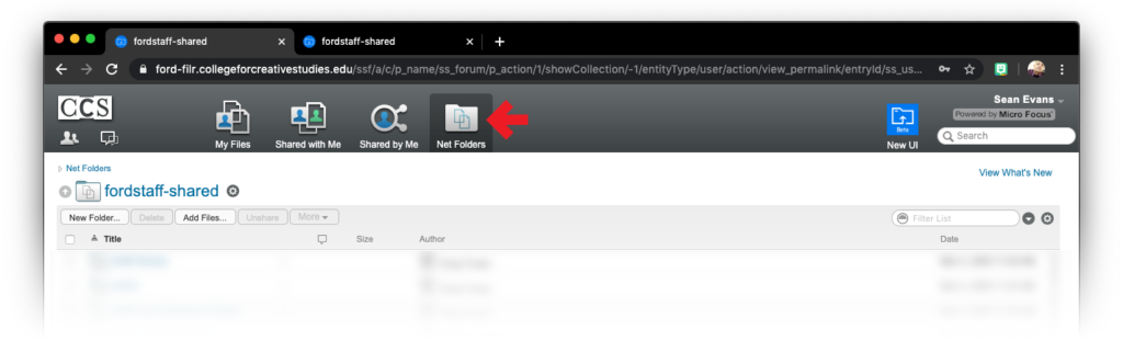 Once you log in, click the Net Folders link at the left side of the browser window to start navigating the folders to which you have access.
